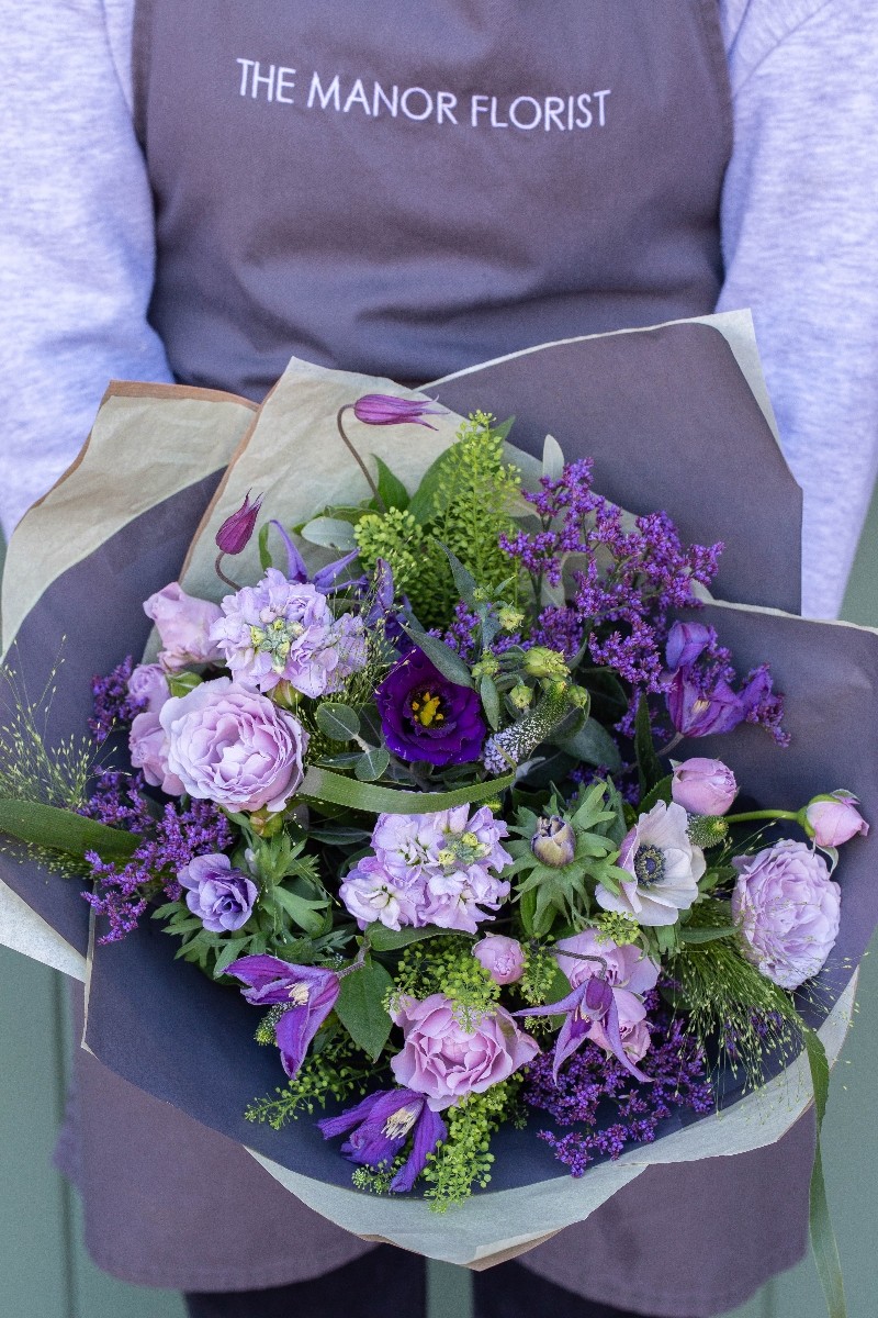 Using the best available stems, this bouquet will contain a selection of seasonal blues, purples, lilacs and creams. Delivered in water.