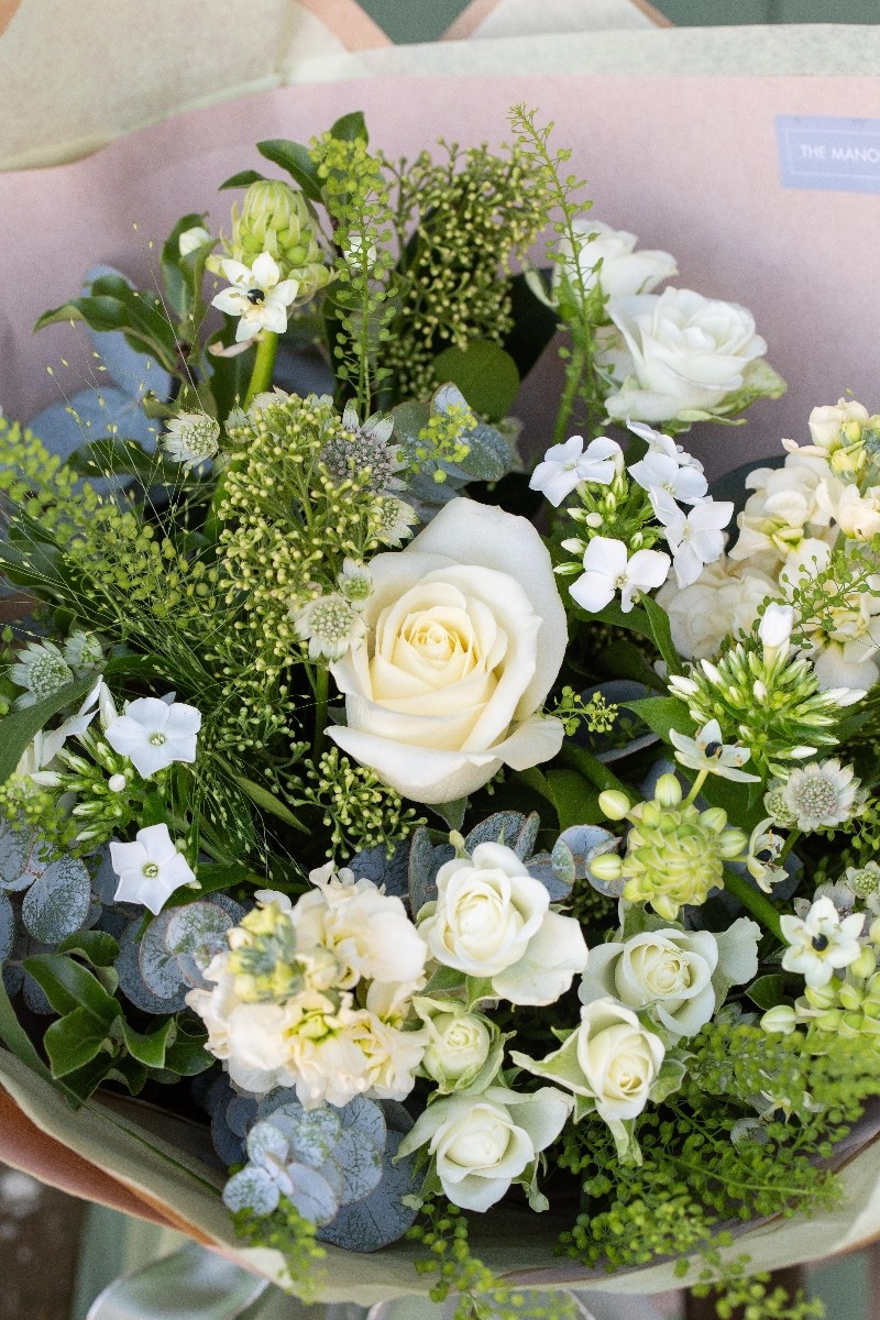 Using the best available stems, this bouquet will contain a selection of seasonal creams, whites and fresh greens, hand tied in a water bubble and presented in a box