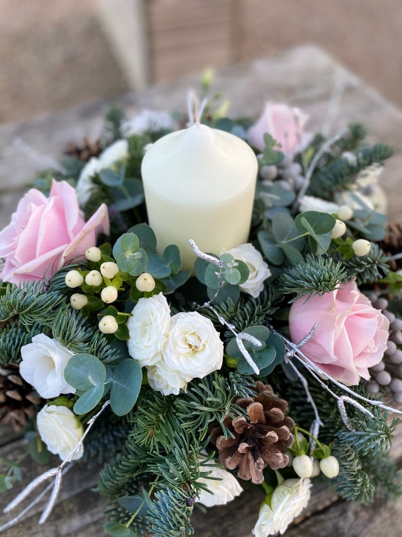Fresh white and pink flowers combine with the cool tones of blue Pine, silver Kaaps and Eucalyptus foliage. Finished with Pine cones and silver twigs in this elegant table centre.