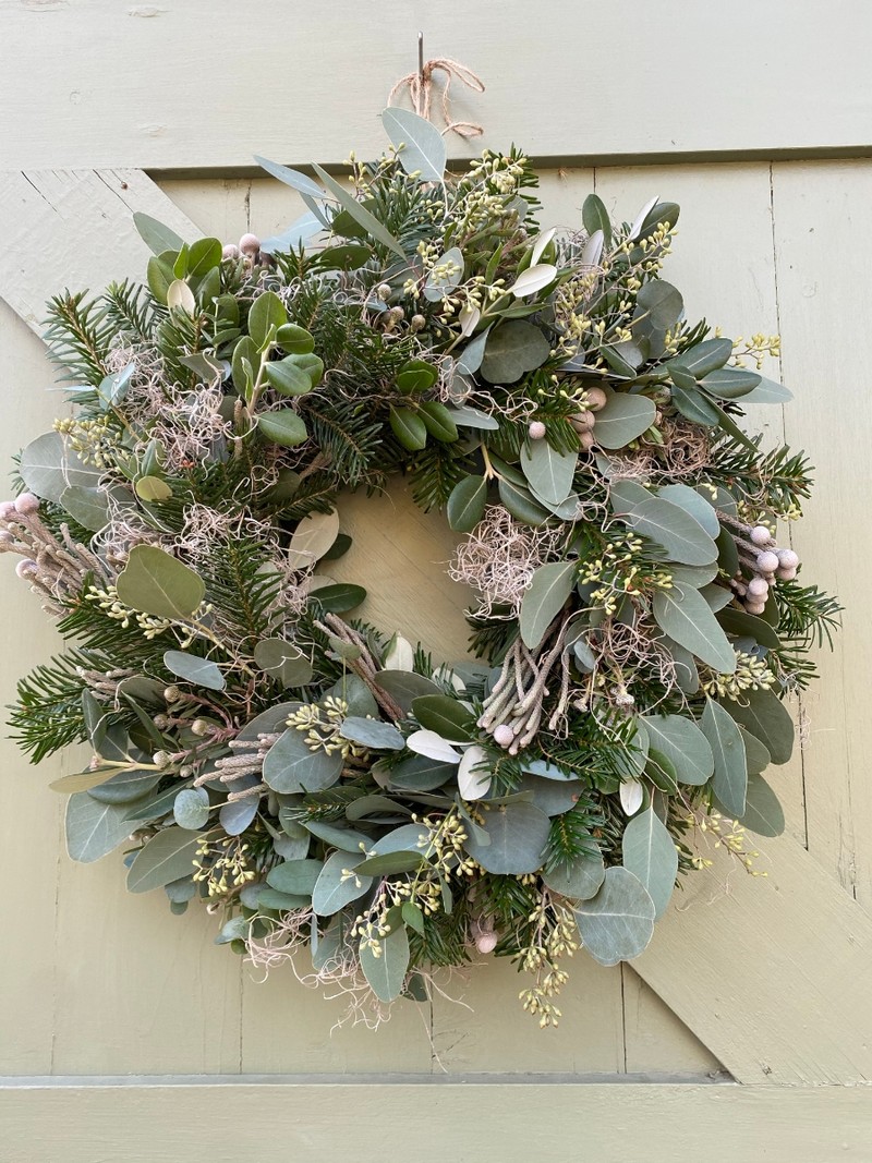 Made with fresh green Fir and Eucalyptus, bound onto a mossed ring. We've added in Tillandsia moss and Kaaps to up the cool tones.
