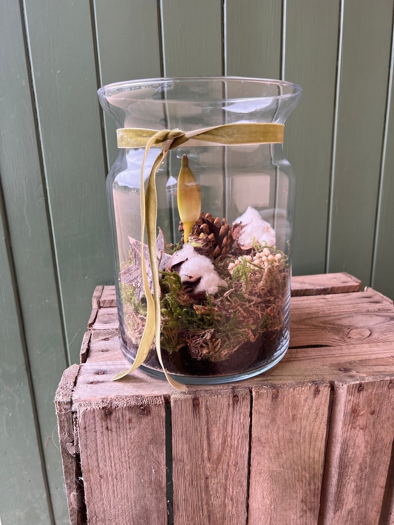 A white Amaryllis bulb planted in a glass vase with decorative accessories