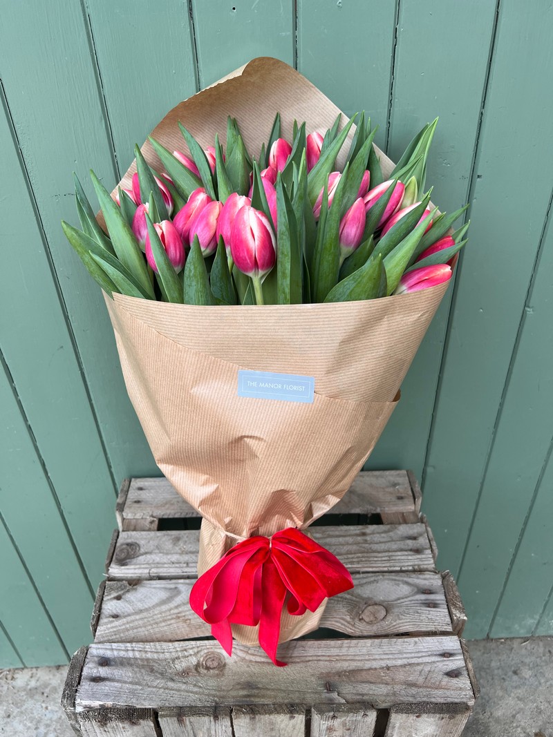 Beautiful dutch tulips wrapped in craft paper , ready for the recipient to arrange into a vase